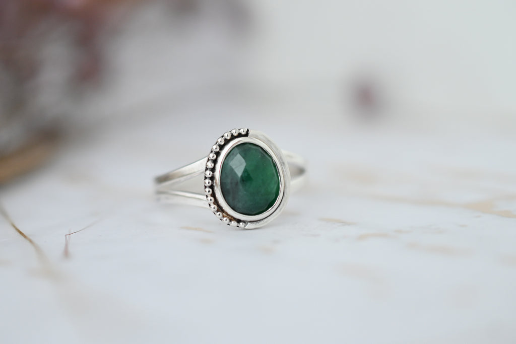 Freeform rose cut emerald set in sterling silver with bead detail. Double band,