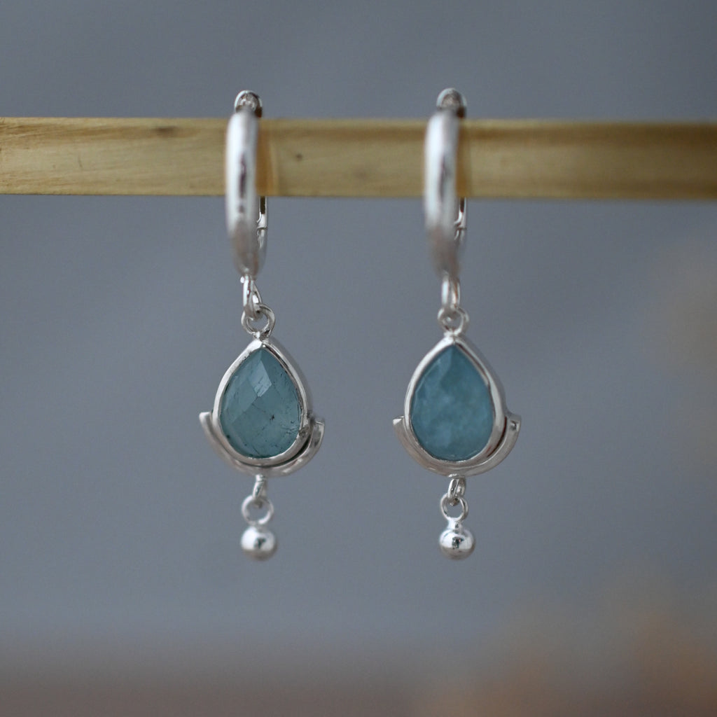Sterling silver huggie hoop earrings with teardrop aquamarine dangles. Total length approx. 1.25 inches.