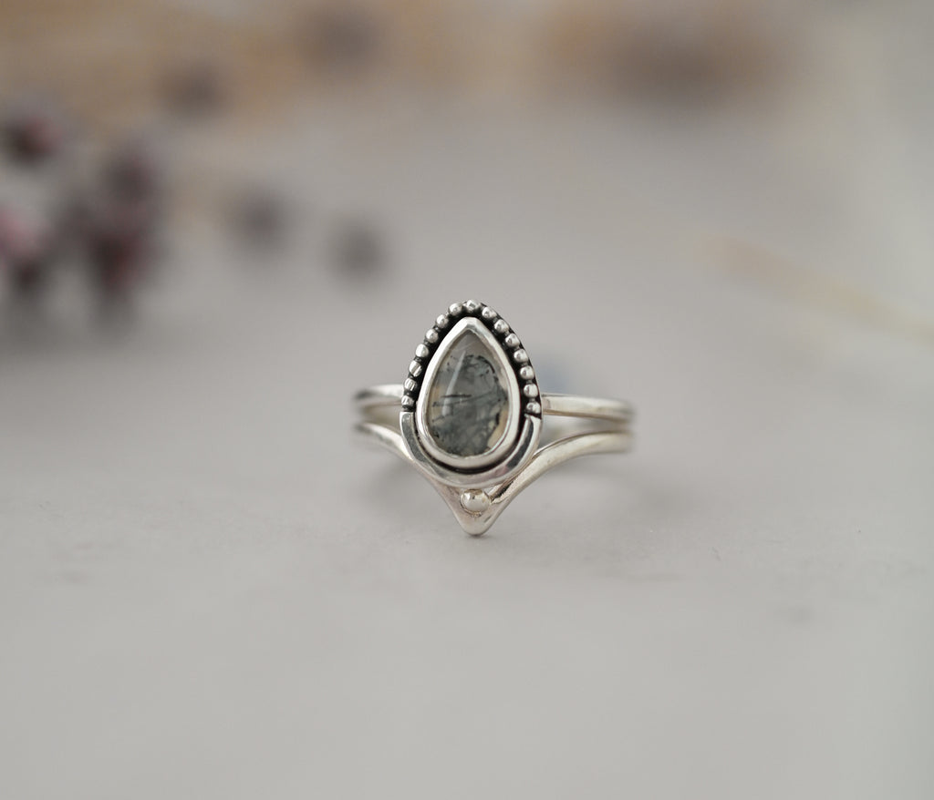 Pear shaped moss agate set in elegant sterling silver double band.