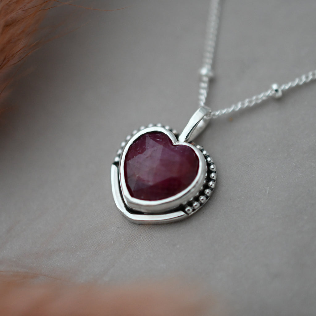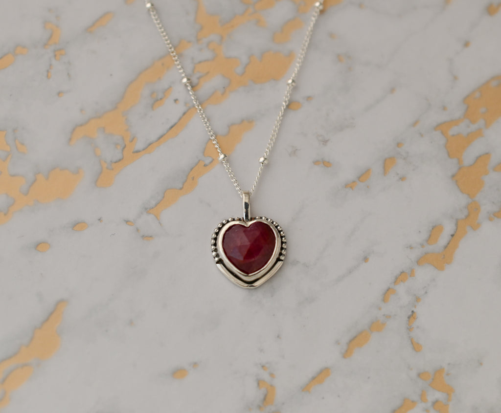 Heart shaped ruby set in sterling silver with beading and trim. Includes 18 inch sterling silver beaded curb chain.